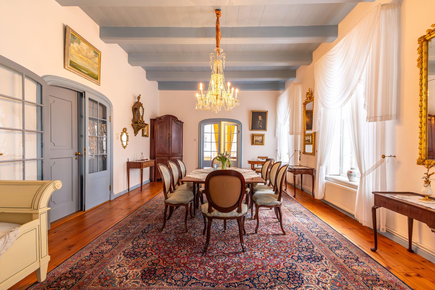 Herzstück der Wohnung ist das großzügige, herrschaftliche Wohn- und Esszimmer. Hohe Decken, große historische Fenster über nahezu die gesamte Raumlänge und eine außergewöhnliche Lichtfülle prägen diesen Raum. Die Wohnung ist mit originalem, historisch erhaltenem Mobiliar ausgestattet: massive Schränke, große Tische und stilvolle Stühle verleihen dem Raum eine repräsentative, würdige Atmosphäre – offen, ruhig und lichtdurchflutet.