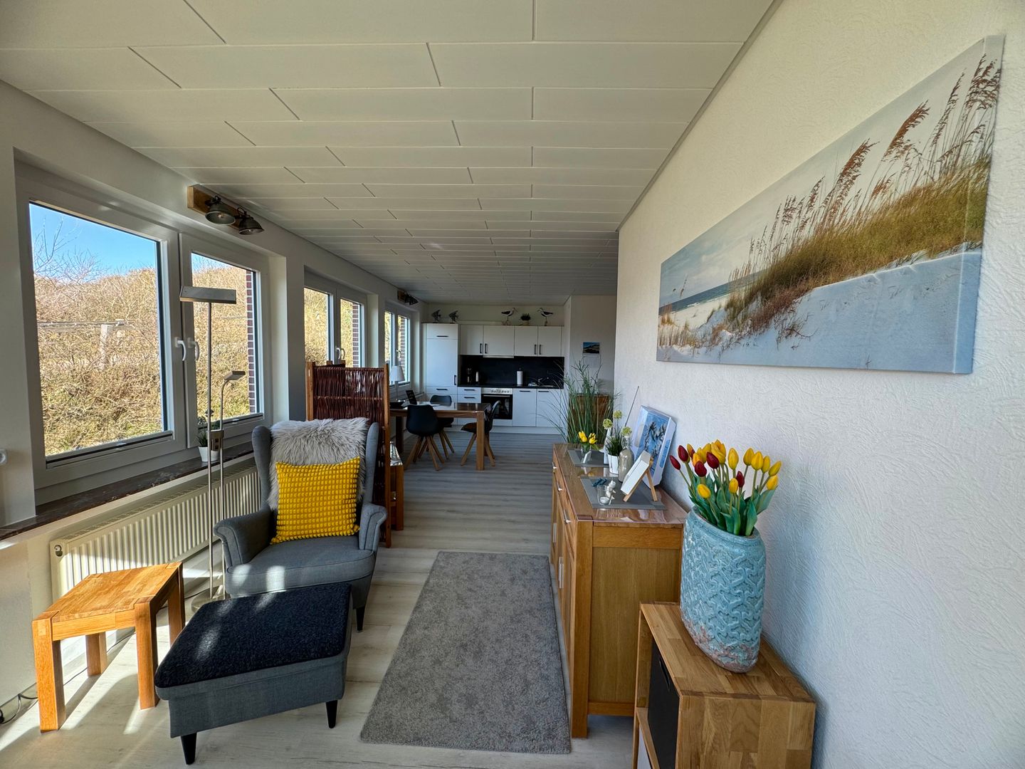 • Wohnbereich: Der große, sonnige Wohnraum ist mit einer Küchenzeile und einer Essgelegenheit ausgestattet. Eine Sofaecke und ein Sessel sorgen für gemütliche Stunden.