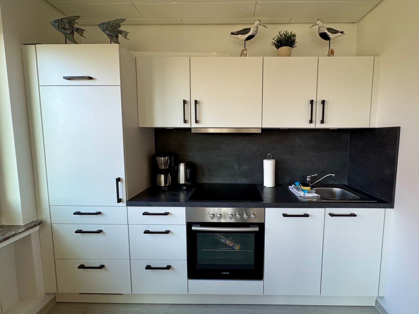 • Küche: Die offene Küche verfügt über einen Kühlschrank mit Gefrierfach, Cerankochfeld, Backofen, Dunstabzugshaube und eine Geschirrspülmaschine. Zusätzlich gibt es eine Kaffeemaschine, Wasserkocher, Toaster, Mixer, Eierkocher sowie Pfannen, Töpfe, Geschirr, Gläser und Besteck.