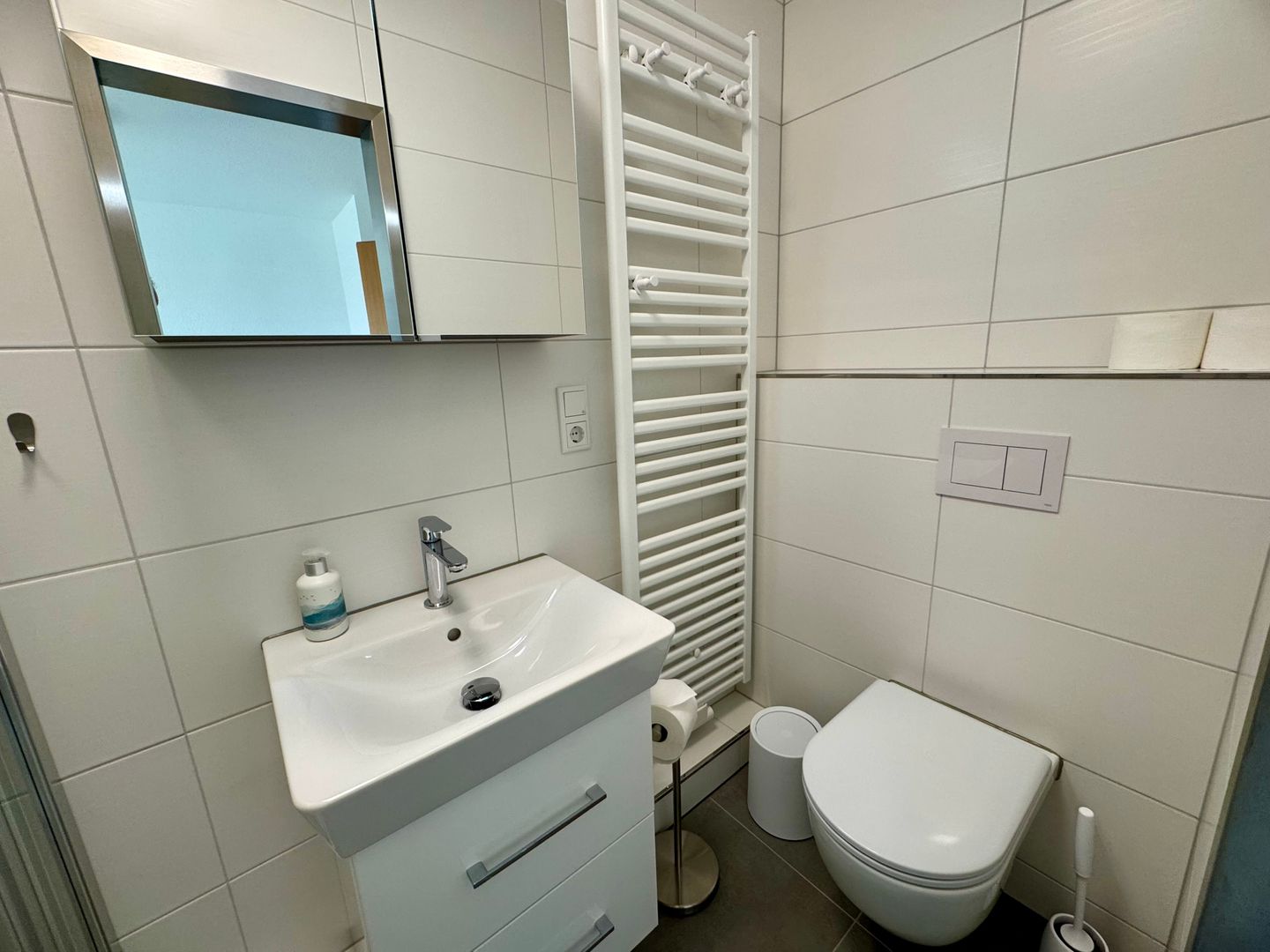 • Badezimmer: Das Badezimmer ist mit einer Dusche, Waschbecken, WC, Spiegel und einem Haartrockner ausgestattet.