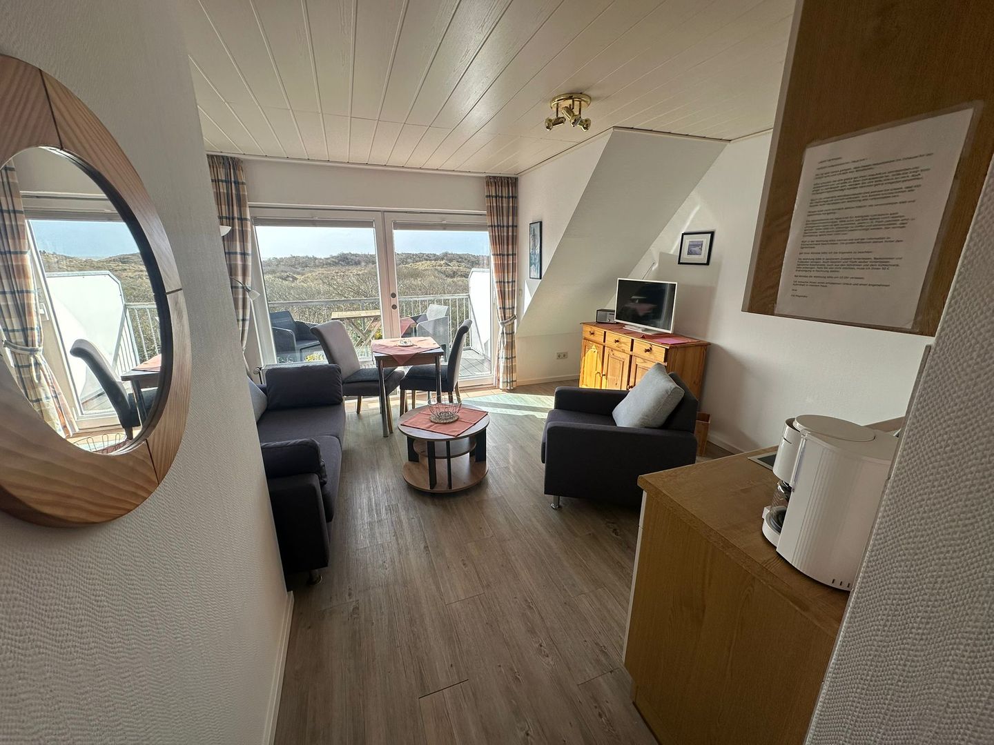 Der Wohnbereich ist hell und freundlich gestaltet und lädt mit einer gemütlichen Sofaecke zum Entspannen ein. Ein Esstisch bietet Platz für gemeinsame Mahlzeiten. Für Unterhaltung stehen TV, Radio und WLAN zur Verfügung, sodass Sie auch im Urlaub komfortabel ausgestattet sind. Große Fenster sorgen für eine angenehme Lichtstimmung, während der Blick über die Dünenlandschaft mit dem Meer in der Ferne echtes Nordseegefühl vermittelt.