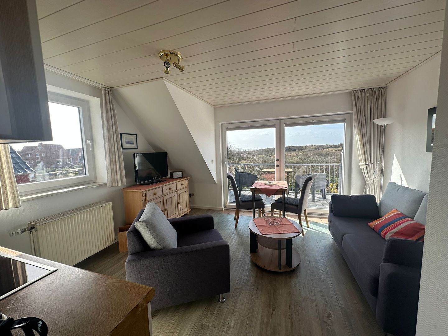 Der helle Wohnbereich lädt mit einer gemütlichen Sofaecke zum Entspannen ein, während ein Esstisch Platz für gemeinsame Mahlzeiten bietet. Für Unterhaltung sorgen ein TV, Radio sowie WLAN, sodass Sie auch im Urlaub bestens vernetzt bleiben. Sichtschutz an allen Fenstern sorgt für Privatsphäre, während der Blick über die Dünenlandschaft mit dem Meer in der Ferne eine besonders entspannte und typische Juist-Atmosphäre schafft.
